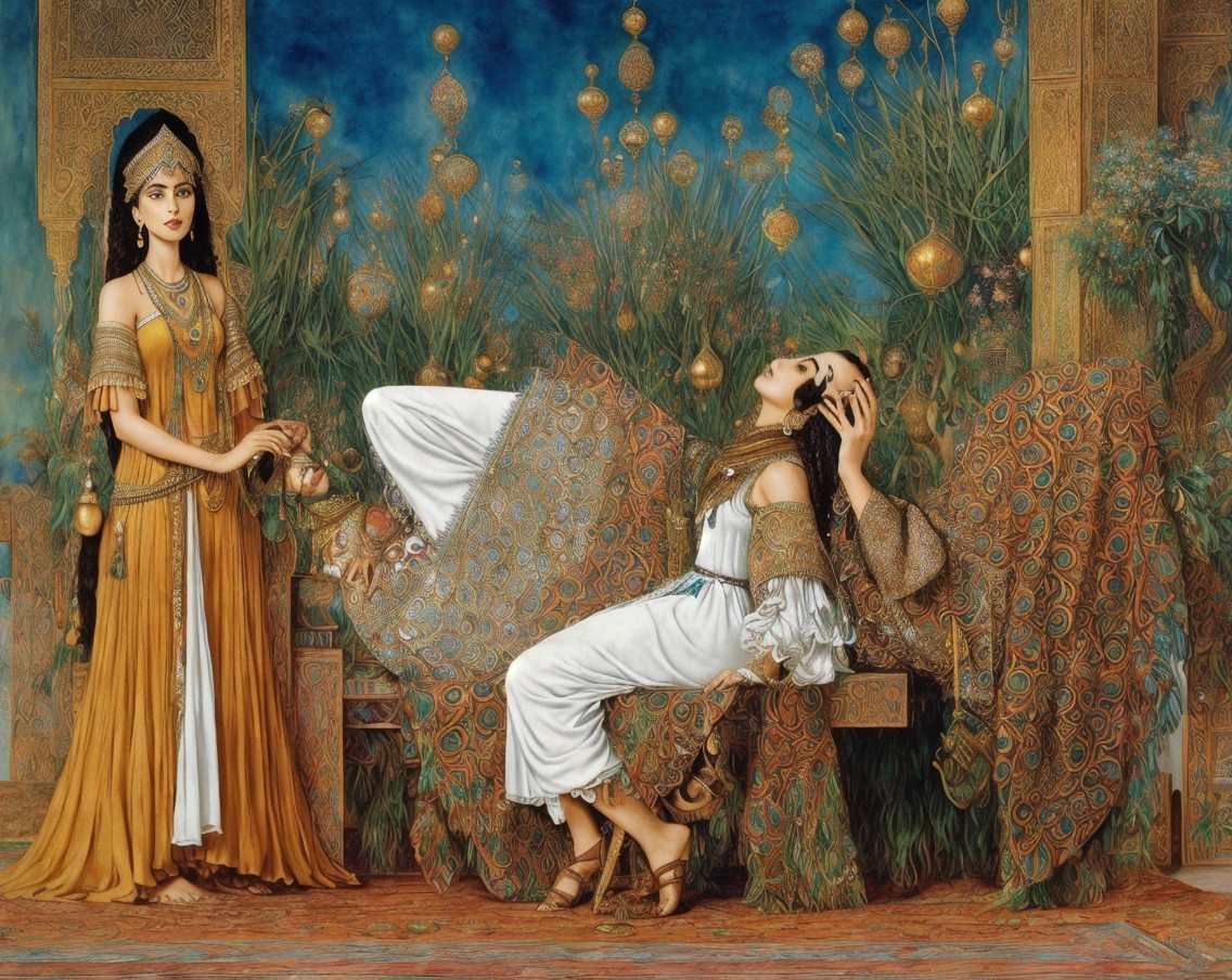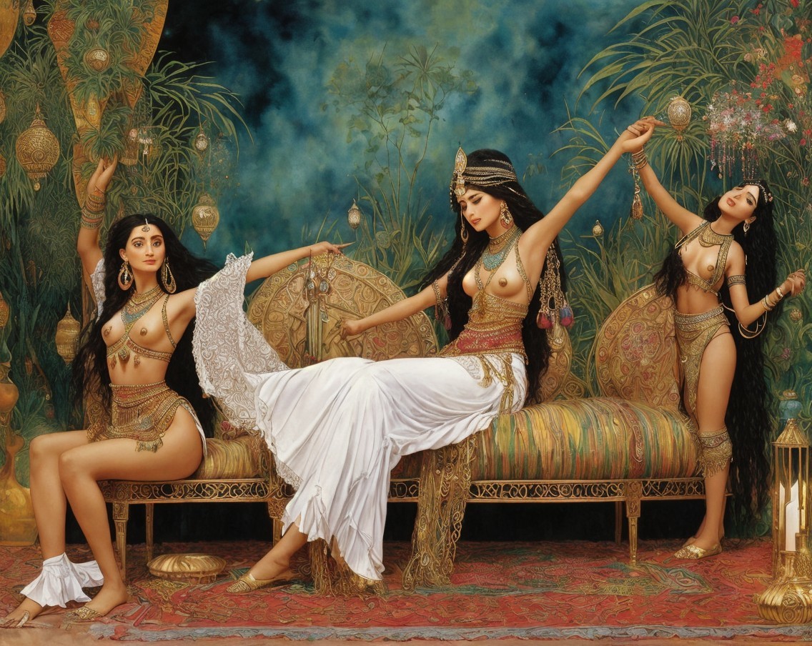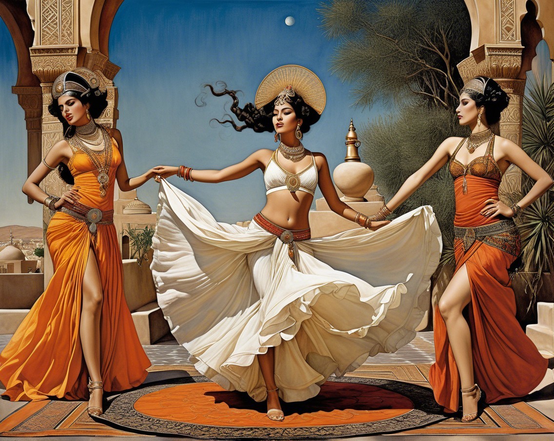 The image depicts three elegantly dressed women in flowing garments, adorned with jewelry, performing a graceful dance in a sunlit, ancient architectural setting adorned with arches and columns.