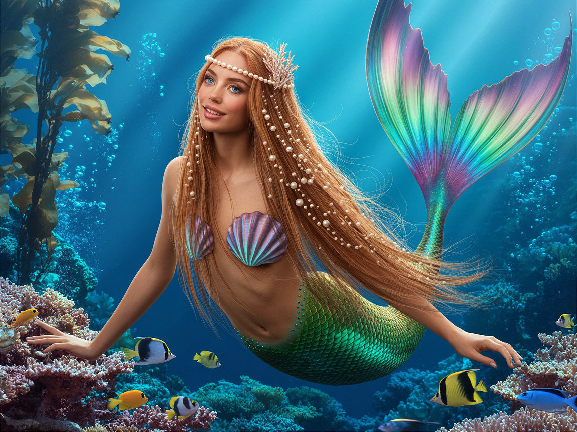 Explore a breathtaking underwater realm filled with enchanting mermaids of stunning beauty. Discover a delightful blonde mermaid with luxurious hair and radiant eyes, embodying happiness and tranquility amidst sparkling treasures.