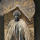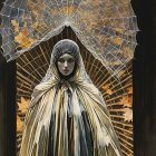 A graceful woman in a black dress and white veil stands in a doorway adorned with spiderwebs. Autumn leaves in shades of orange frame the scene, creating a haunting yet elegant atmosphere.