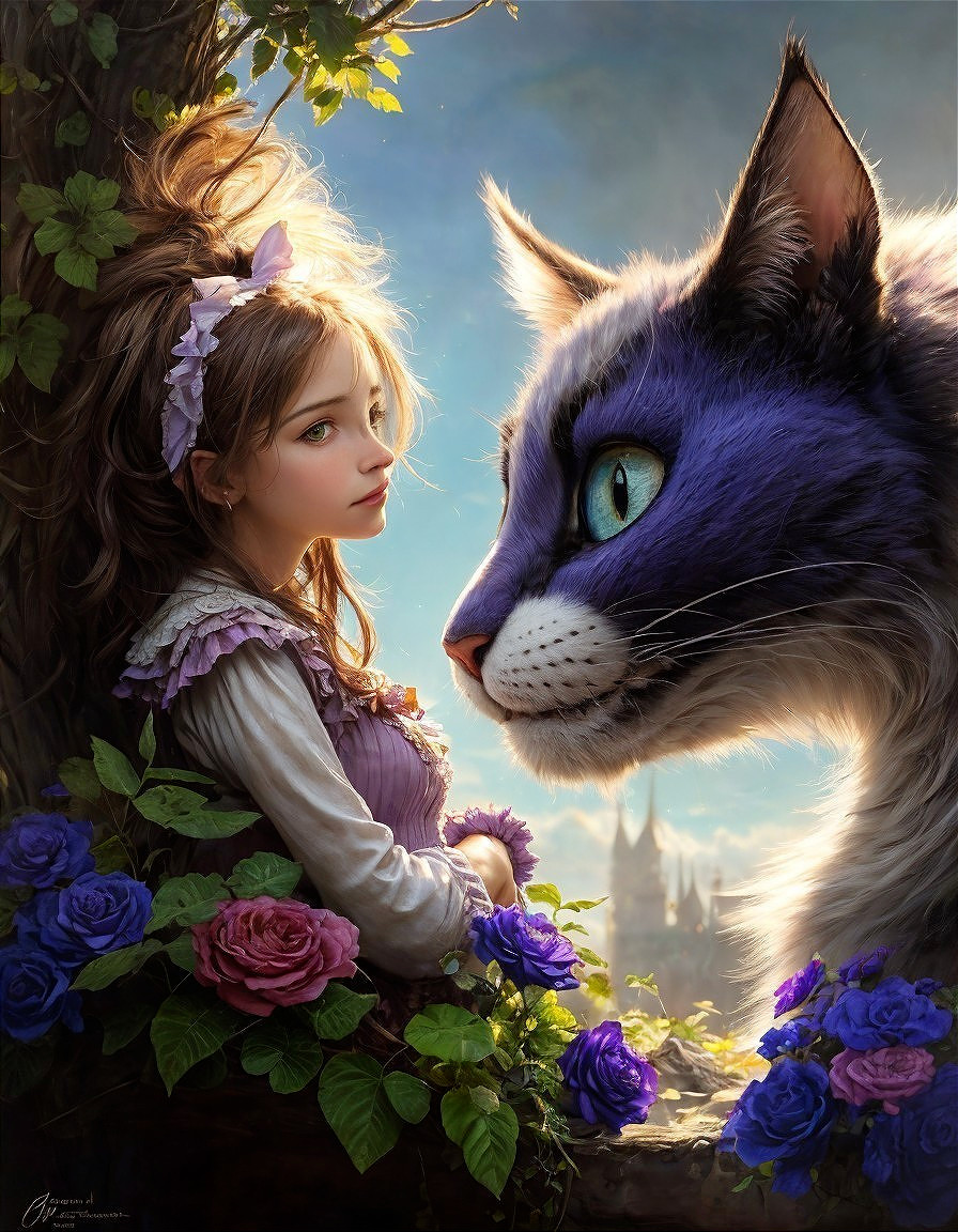(Try from Алексей Анишкевич) - A whimsical scene featuring a young girl with flowers in her hair, gazing at an enormous, vibrant purple cat, surrounded by colorful roses and a fantastical background.