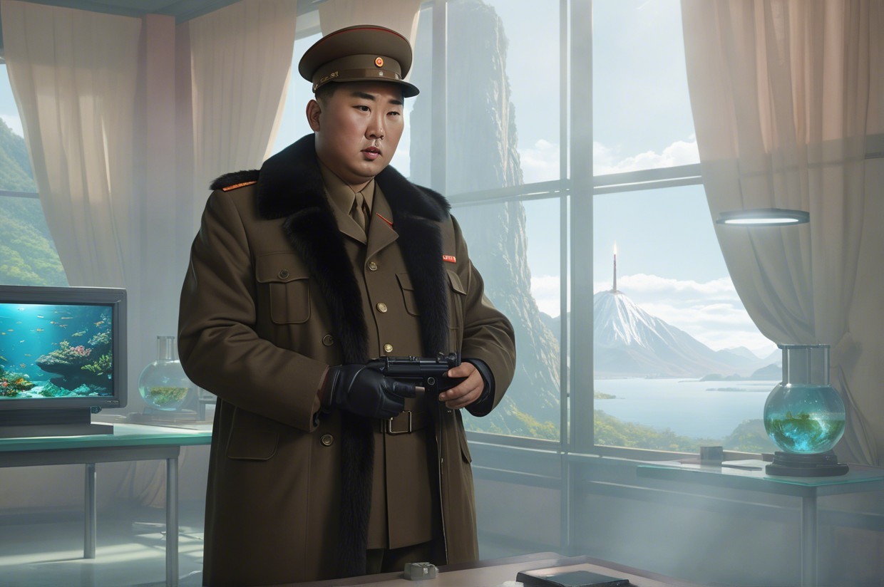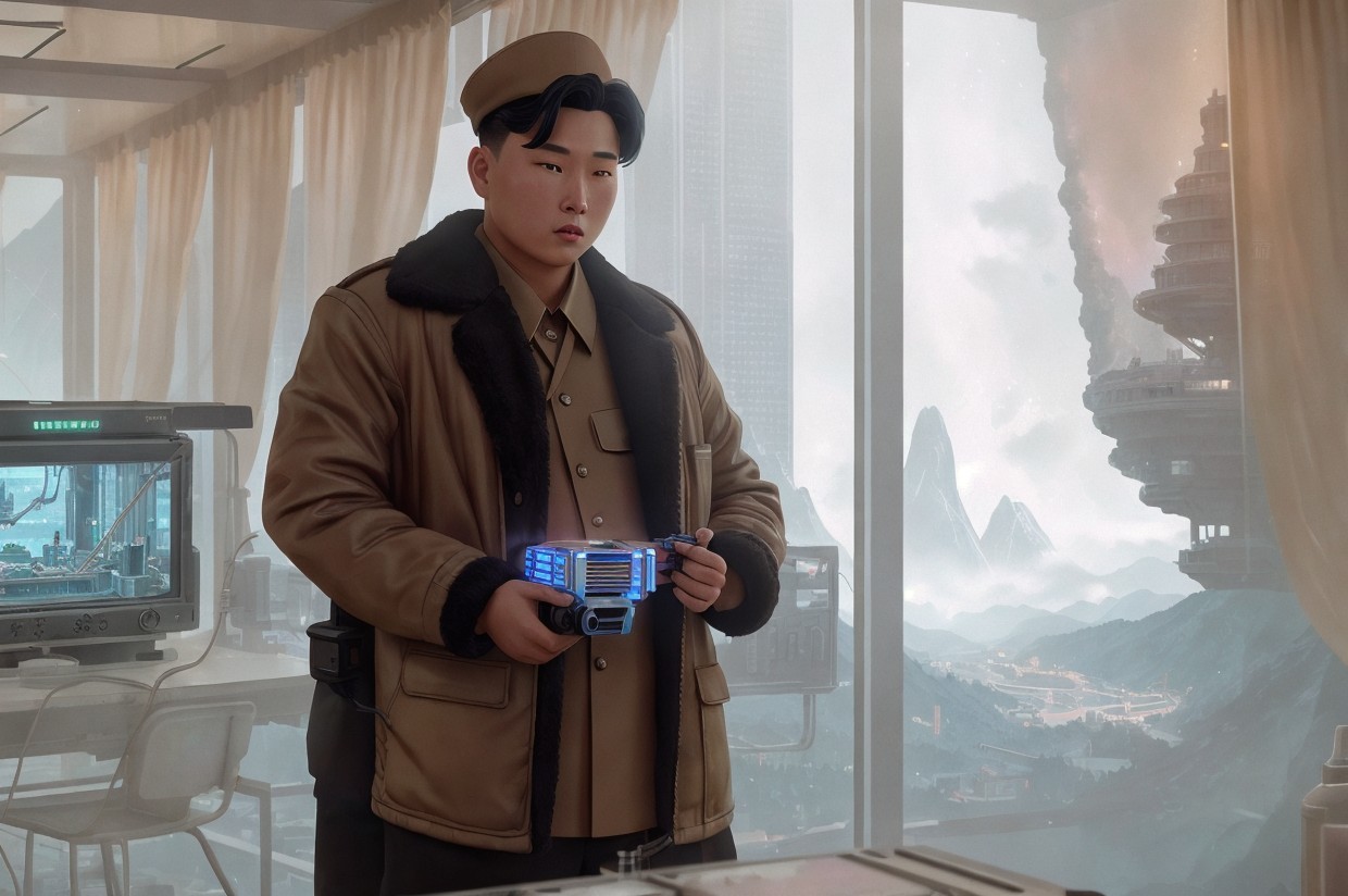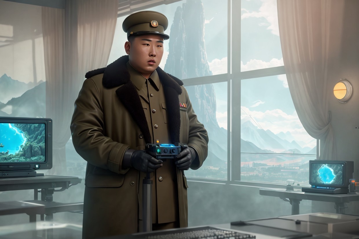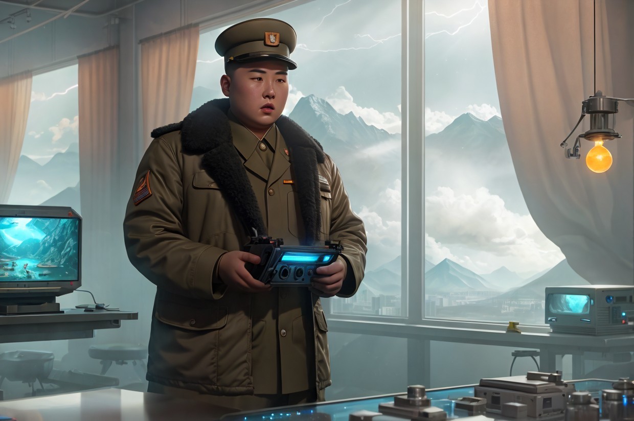 + Prompt:draw a scene from the movie: a retro laboratory with daylight, where North Korean soldiers catch a small holographic lightning in an aquarium with mountains, retro computers on the tables, large round windows on the walls, a view of Pyongyang