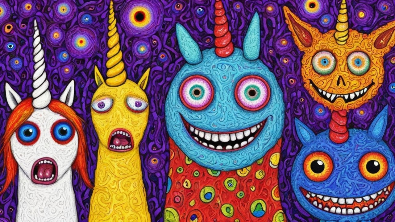 A vibrant illustration features four whimsical creatures with exaggerated features and colorful patterns, set against a swirly purple background, evoking a playful and surreal atmosphere.