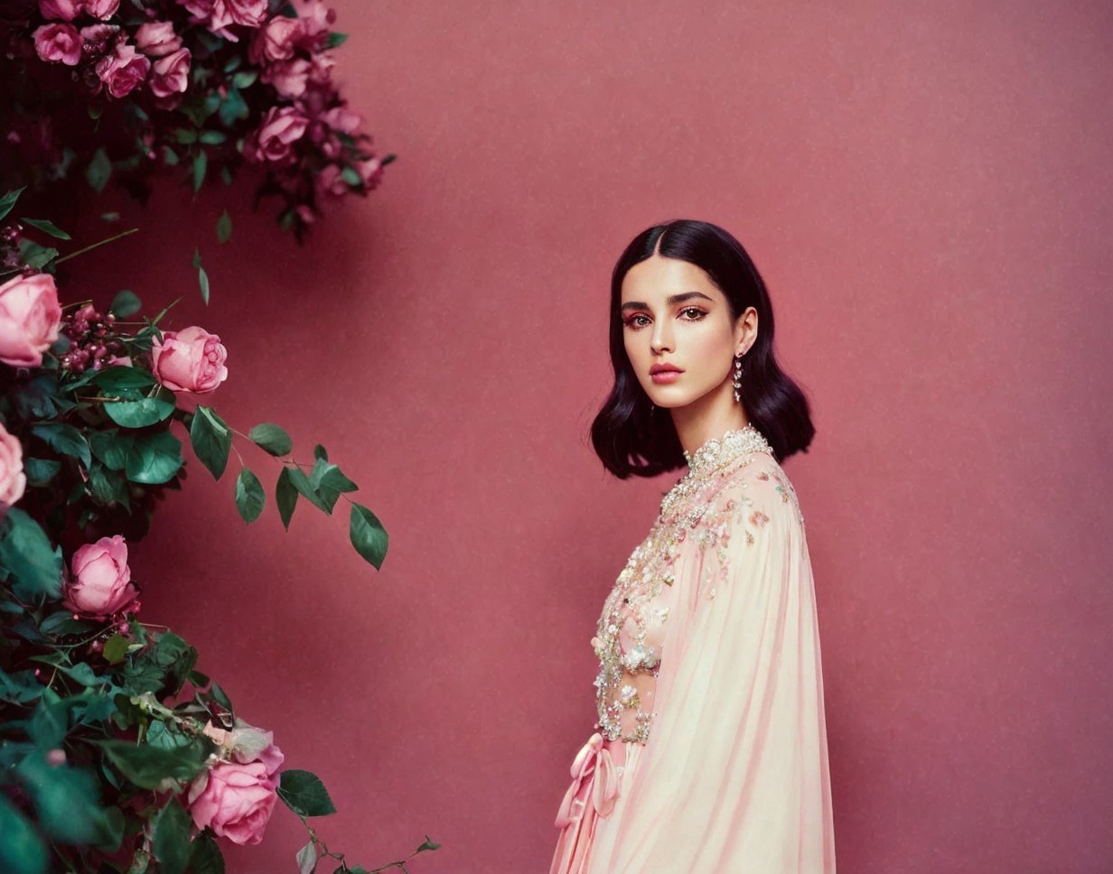 A poised woman with sleek, dark hair stands against a soft pink backdrop, adorned in a delicate gown with intricate embellishments, surrounded by blooming roses, creating an elegant atmosphere.