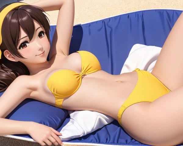 A charming anime character in a vibrant flaming oil-patterned strapless swimsuit, exuding summer vibes with playful energy and a cheerful expression, perfect for beach adventures and fun in the sun.