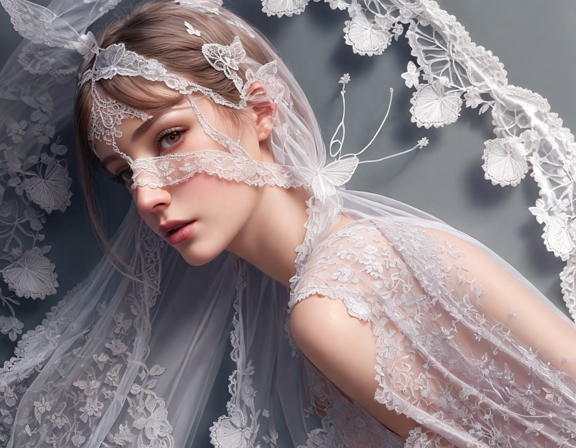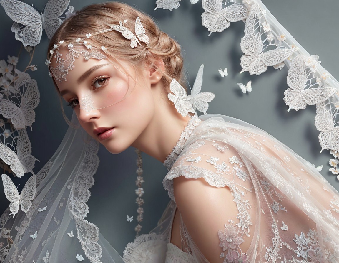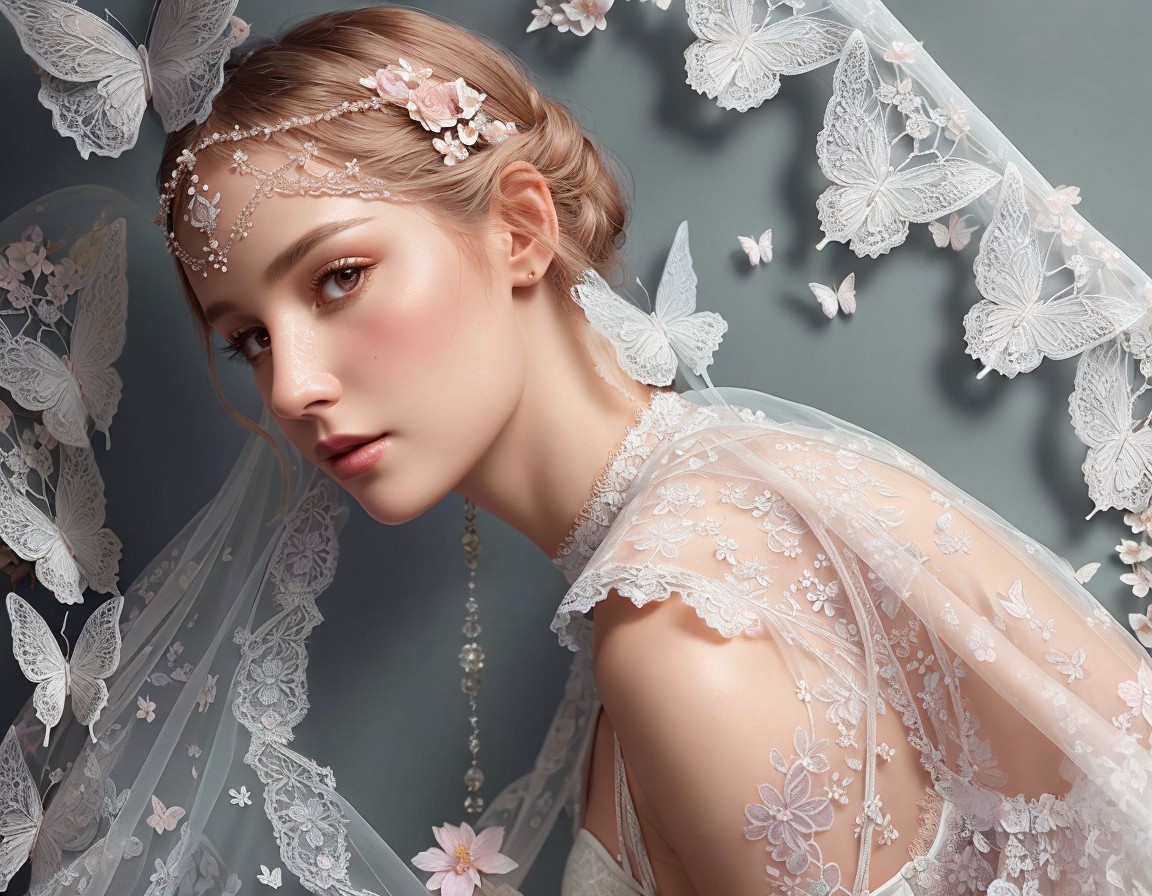 (Try from Amanda) - A serene bridal portrait featuring a woman in an elegant lace gown and veil, adorned with delicate floral and butterfly embellishments against a soft gray backdrop.
