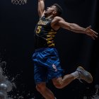 A dynamic basketball player performs an impressive slam dunk, showcasing athleticism and focus. The action is enhanced by dramatic lighting and a dark, energetic background.