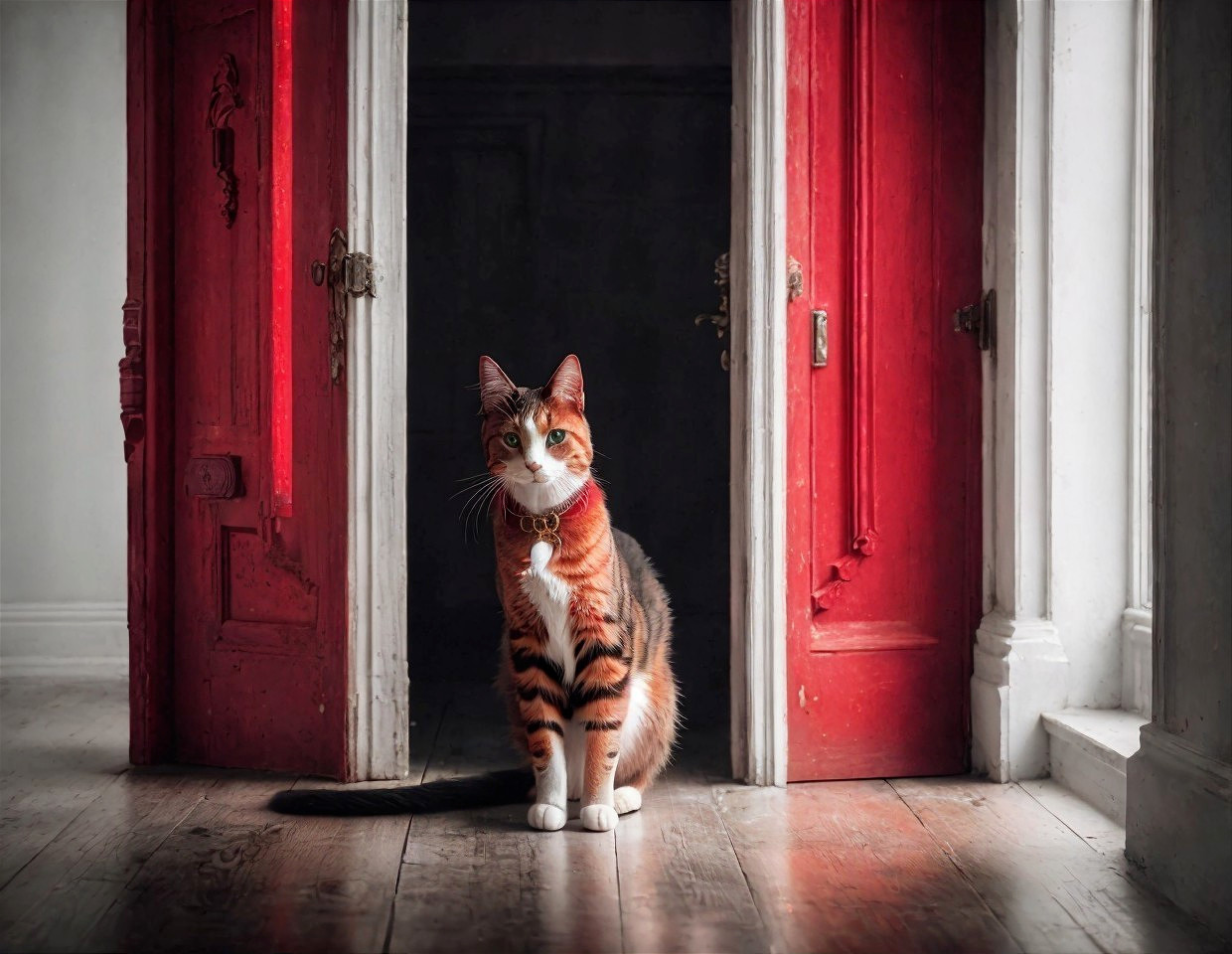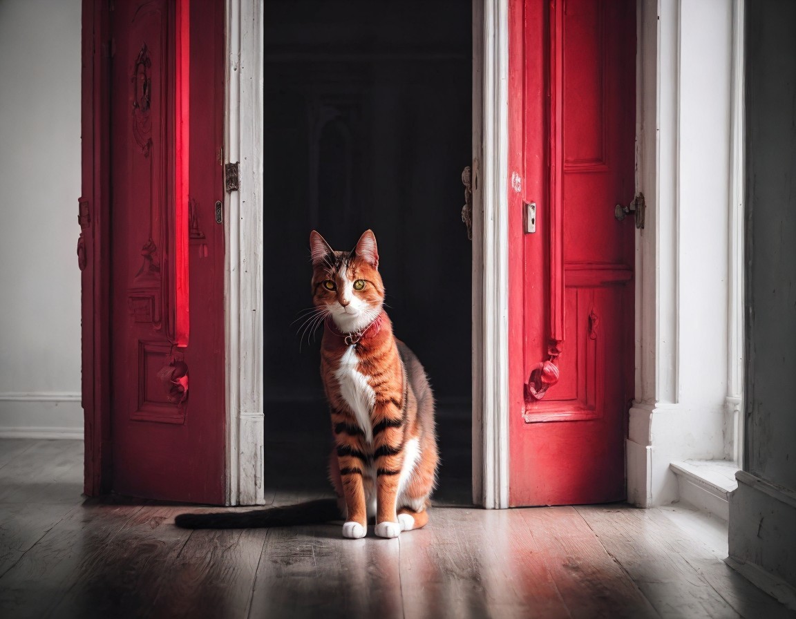 A striped cat sits elegantly in a doorway, framed by striking red doors. Sunlight filters in, highlighting its features against the dark background of the room. A serene and charming scene.