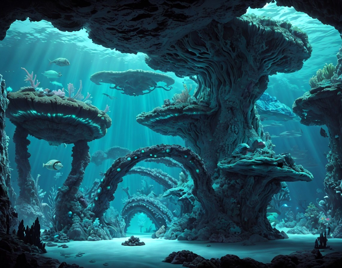 Underwater Spaceship, UFO, Extraterrestrial laboratory assimilated with advanced alien technology in a deep-sea aquatic landscape. Dynamic landscape with massive ravines and a bioluminescent coral reef, statues of neptune, fish, squid and octopuses, large jagged phosphorescent crystals. Cthulu like sea monster with long tentacles and wings. sacred geometry, mystical, Realistic and natural elements, In the style of Cameron Gray