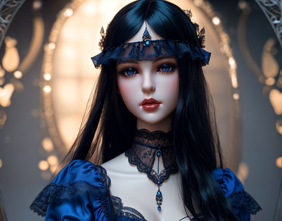 Prompt: "a seductive bjd doll with long black hair and retarded look on her face in cute blue lace lingerie, show full body, visionary art, mirrored, figurativ, dreamy, translucent elegant extremely detailed fantasy very attractive beautiful high definition crisp quality Hans Zatzka Victor-Gabriel Gilbert"