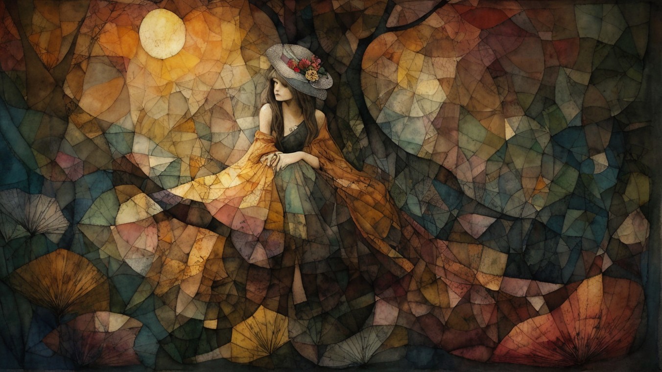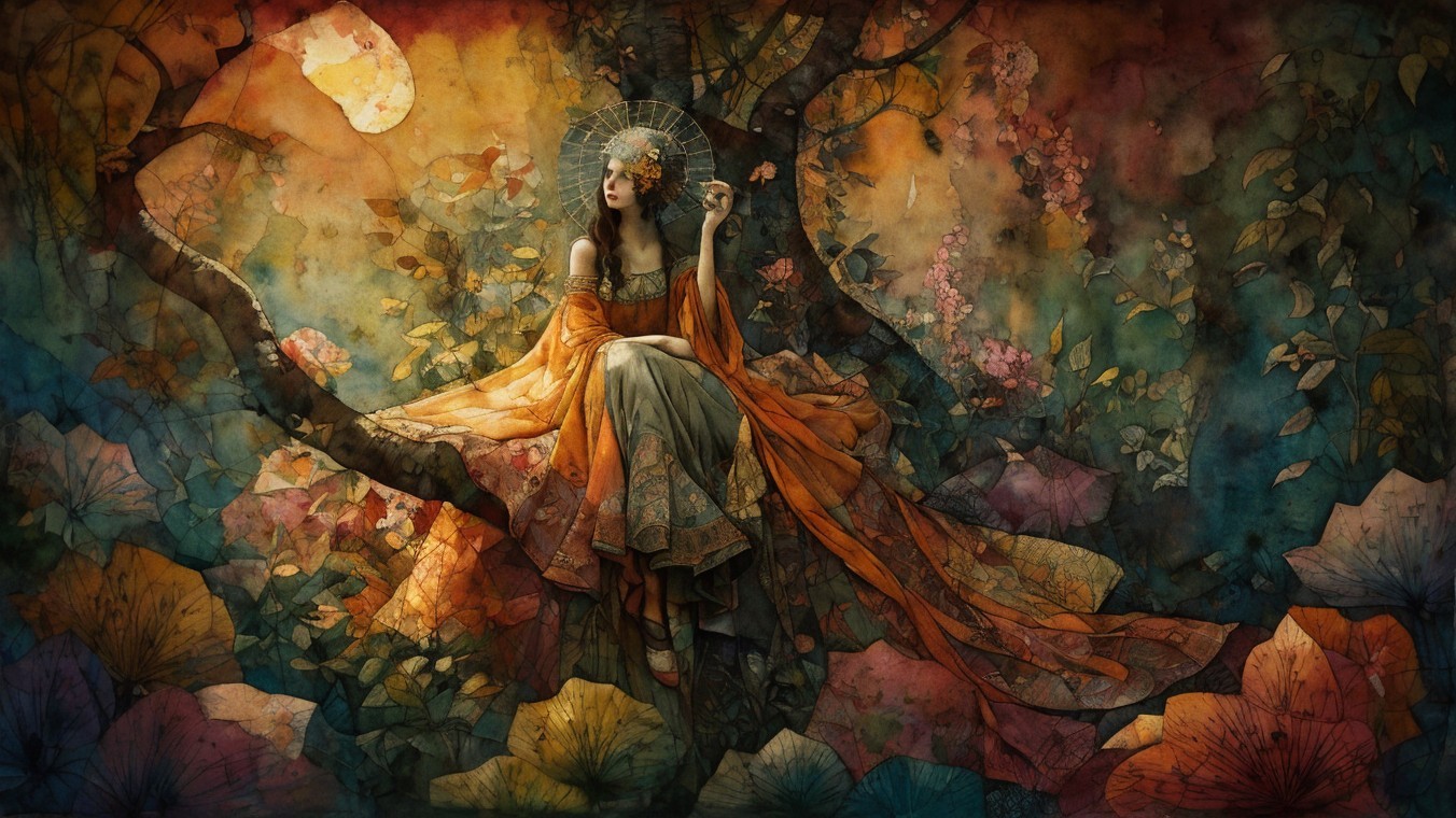 A serene, dreamlike figure of a woman is surrounded by abstract, warm-toned shapes and patterns. The artwork features soft lines, a glowing sun, and a floral accent in her hair.