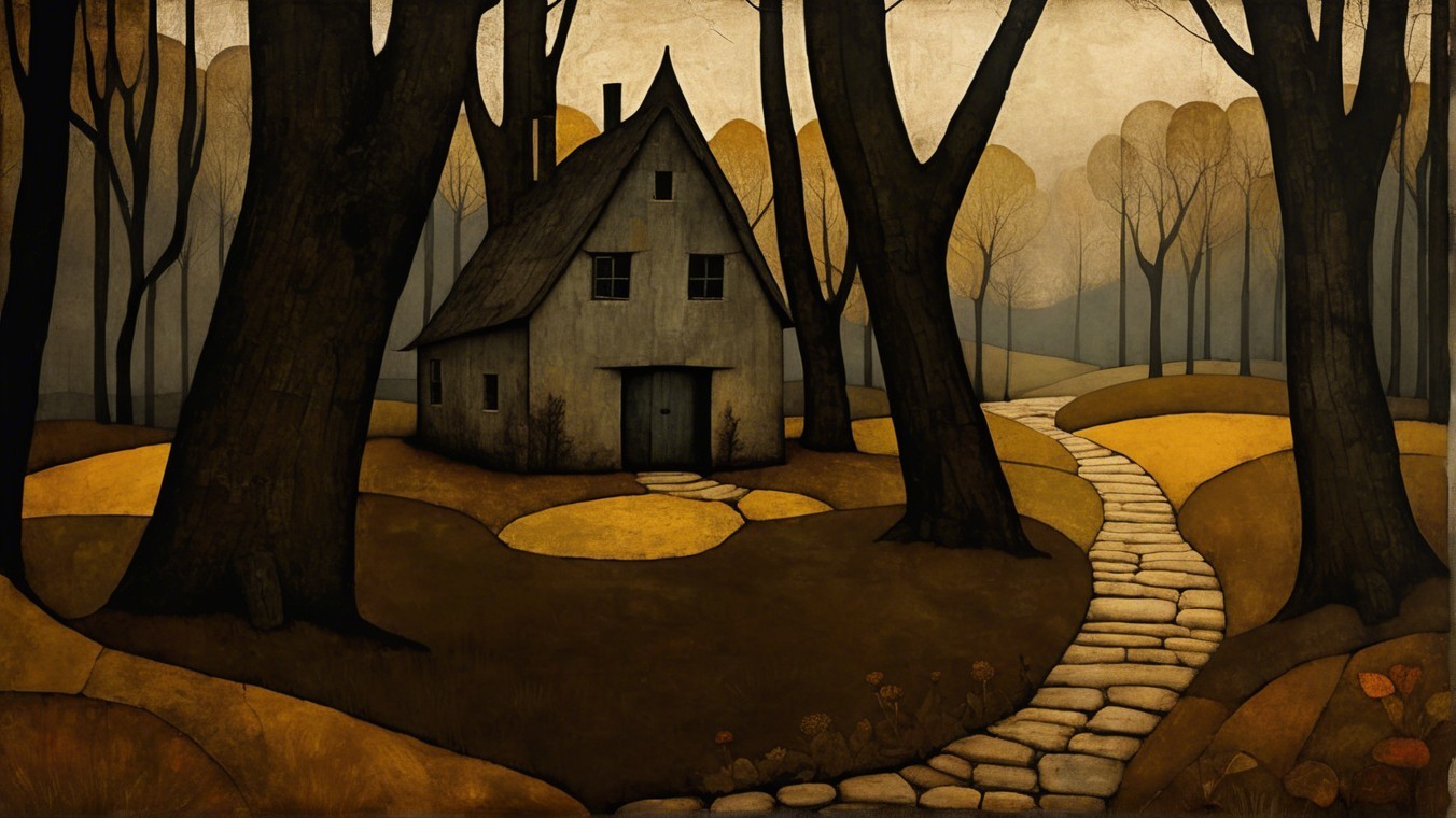 A serene autumn landscape features a quaint church surrounded by dark, tall trees. A winding path leads to the church, while gentle hills and distant buildings outline the warm, golden background.