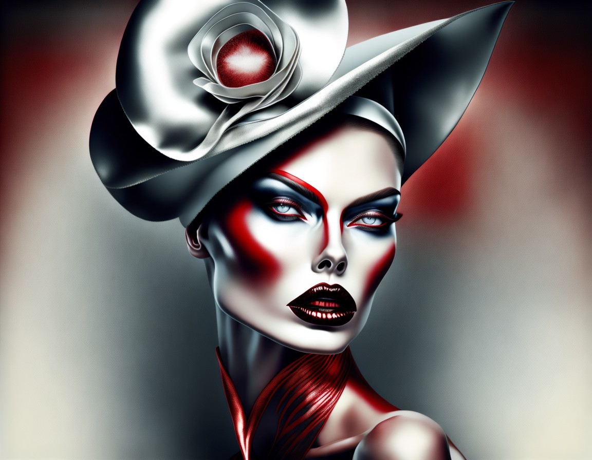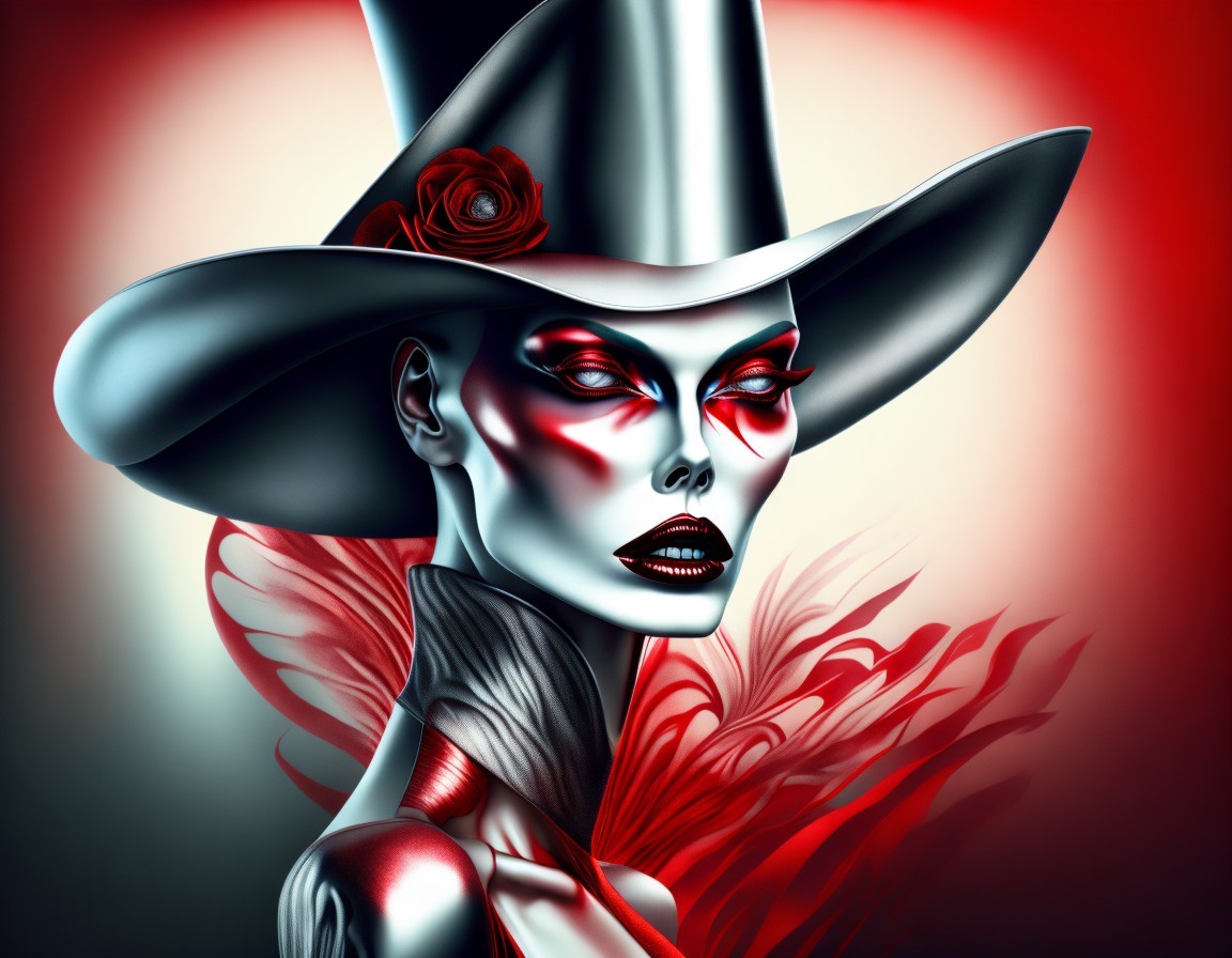 A stylized illustration of a woman with striking red and blue colors, wearing a top hat, and adorned with elegant, artistic makeup.