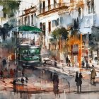A bustling city street scene captured in watercolor, showcasing pedestrians crossing, vintage cars, and charming buildings reflecting sunlight, with an interplay of light and shadow.
