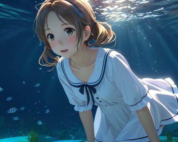 A charming anime girl flaunts her emerald-winged swimsuit, radiating a playful and vibrant energy. Her bright eyes and cheerful smile complement the whimsical design, capturing a sense of summer fun.