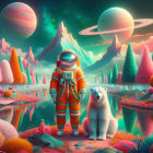 An astronaut in an orange suit stands by a reflective pool, with a polar bear nearby. Surrounded by vibrant pink trees and colorful, fluffy spheres, Saturn looms majestically in the sky.