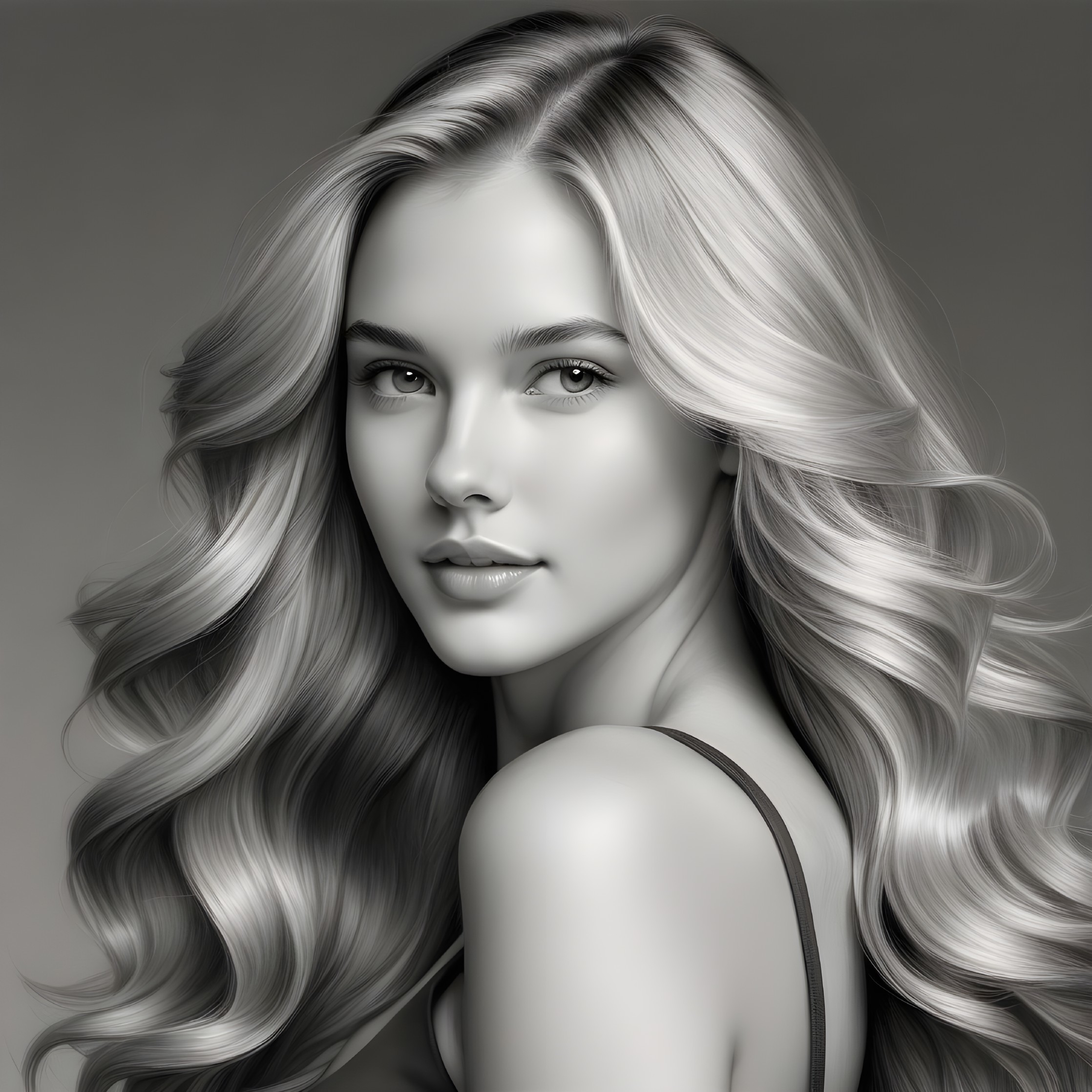 A monochromatic portrait of a young woman with long, flowing, wavy hair. She has a serene expression, captivating eyes, and smooth skin, creating a timeless and elegant appearance.