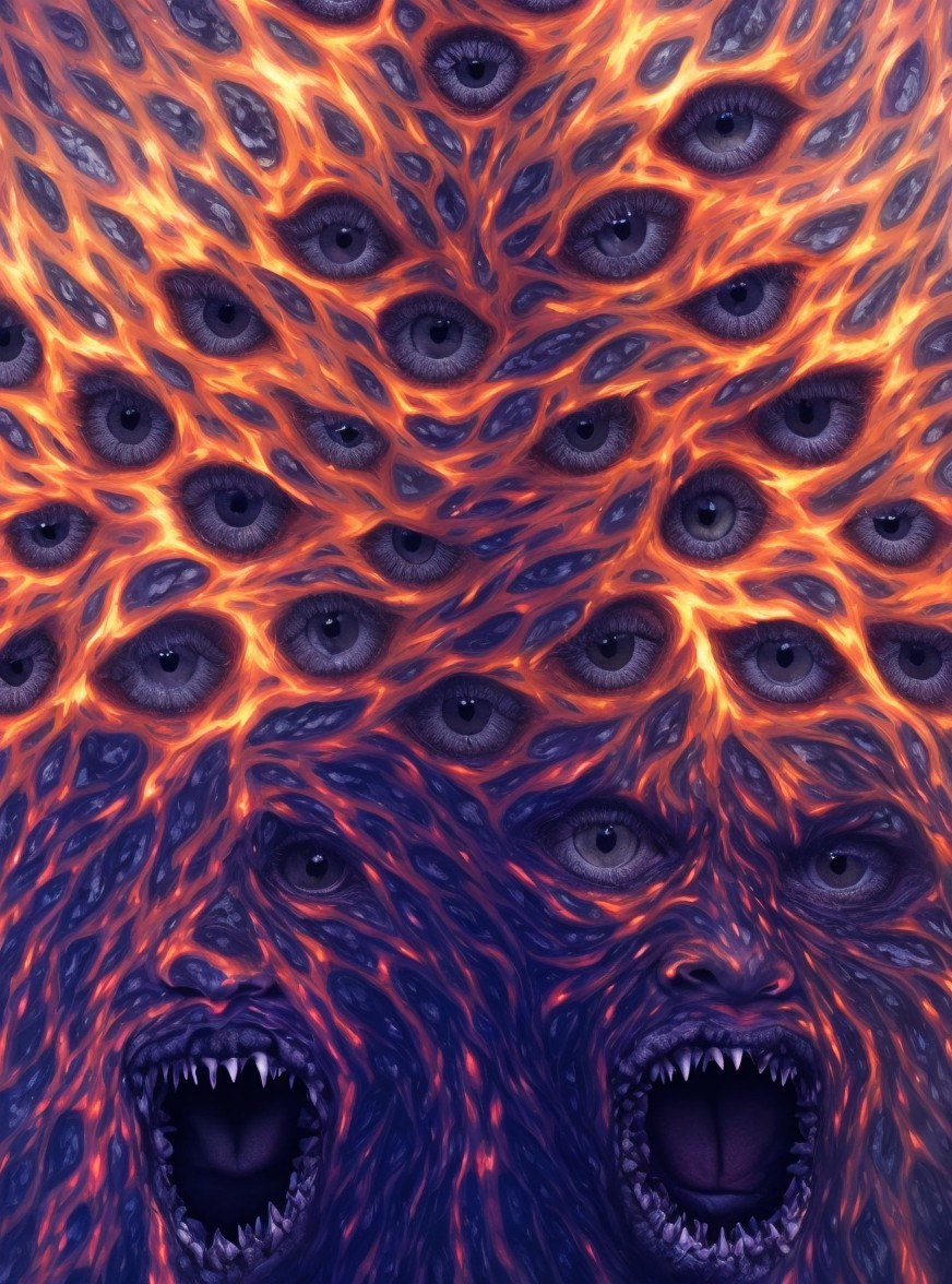 + Prompt:Create an illustration of a menacing, monstrous face emerging from a dark, textured background composed entirely of smaller, grotesque faces, each individually contorted in various expressions. The main monstrous face should be predominantly dark with highlights and shadows creating a glossy, wet appearance. The key features of the face to emphasize are the two large, glowing, fiery red eyes that are menacingly peering forward. The eyes should be deeply set into the face, with heavy brows above them. The nose should be broad and flat, with a sheen that implies a leathery texture, melding seamlessly into the smaller faces around it. No visible mouth is needed; instead, the smaller faces create the illusion of the mouth's shape. A vertical alignment of minimally visible smaller faces, resembling a spine or ridge, should extend from between the eyes downward. The overall color palette is ominous and dark, predominantly black and shades of gray, with strategic highlights to accentuate the features of the larger face and to provide a sense of depth among the sea of smaller faces. Each small face is unique, with a range of eye and mouth positions, creating an overall feeling of chaos and disorder. The illustration should evoke a sensation of dread and the supernatural.