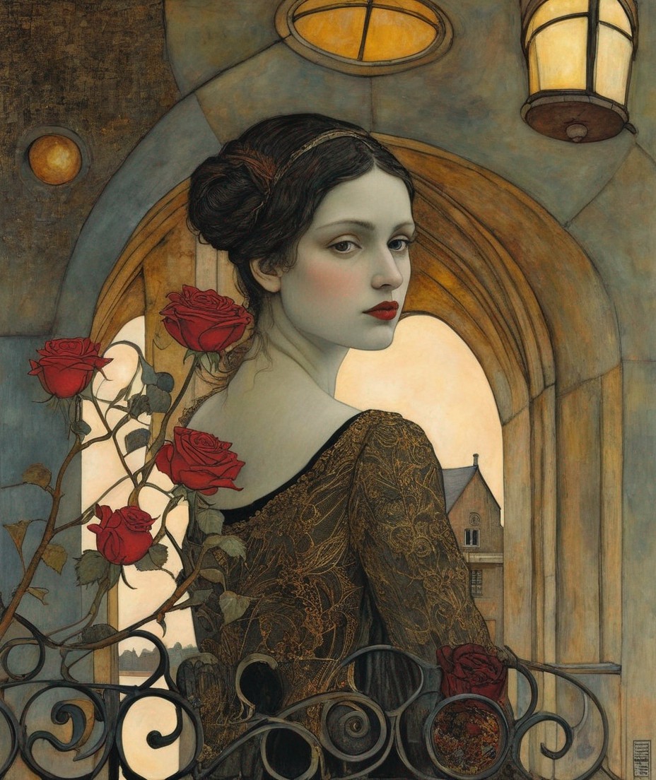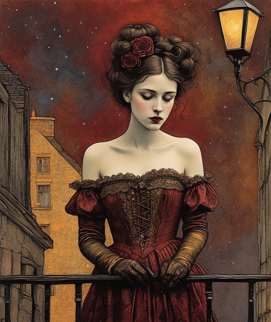 + Prompt:She wasn’t doing a thing that I could see, except standing there leaning on the balcony railing, holding the universe together., whimsical, beautiful, poignant, touching. colors rose, gold, rust, burgundy, black.