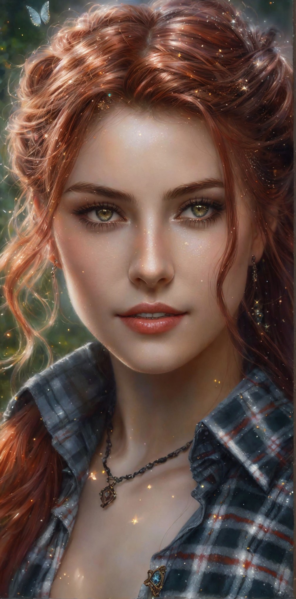 Pretty young woman in a long-sleeved plaid shirt, dark tones, natural red hair, Hair tied in a bun, smiling, looking beautiful