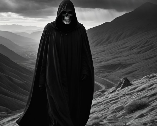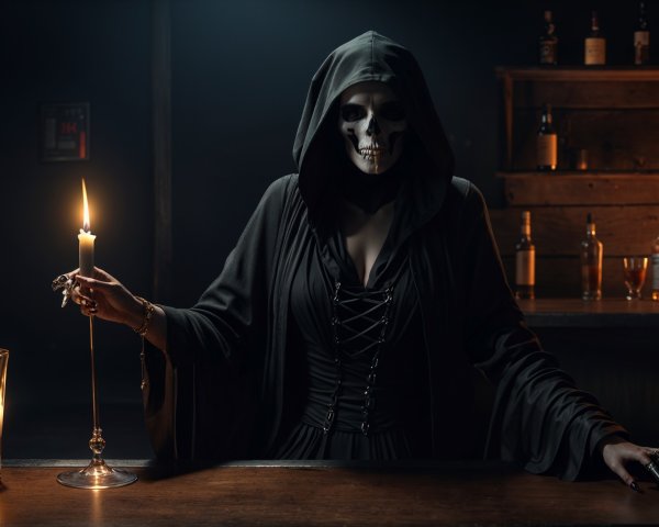 A hauntingly beautiful depiction of a skull-faced figure with long, dark hair, dressed in a ruffled black outfit. The contrast between life and death evokes an eerie yet captivating atmosphere.