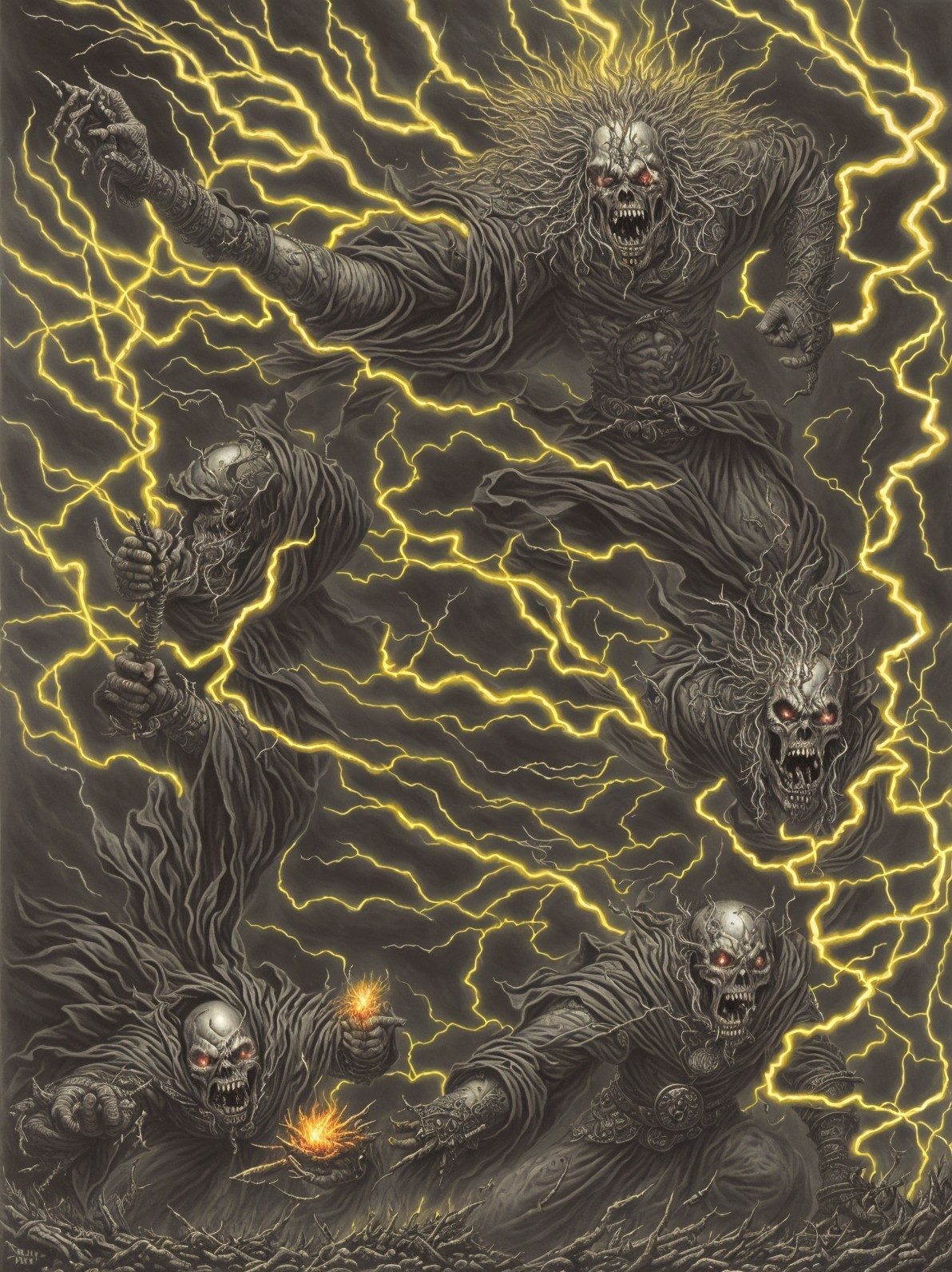 A powerful sorcerer channels lightning amidst skeletal warriors in a dark, stormy atmosphere.