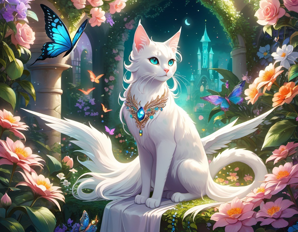 A majestic white cat with wings, adorned with jewels, sits amidst flowers with butterflies near a fantasy castle.