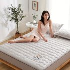 A young woman sits gracefully on a pale blue mattress, wearing a light pink dress. She poses with a serene expression against a backdrop of bright blue skies and greenery.