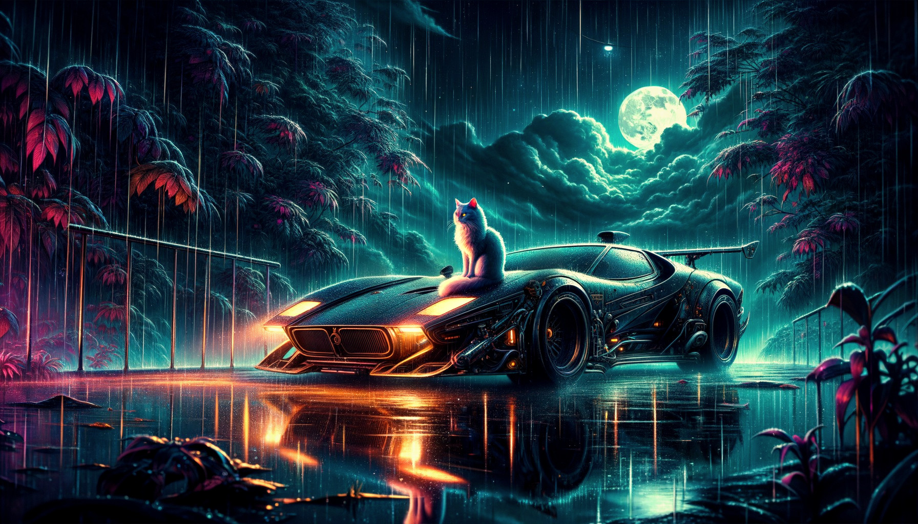 A cat sits atop a sleek car under a moonlit, rainy sky amidst vibrant tropical foliage.