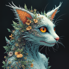 A surreal cat with flowing, floral fur blends seamlessly with vibrant plants and blossoms. Its bright orange eyes contrast with the soft pastel shades, creating an enchanting and whimsical appearance.