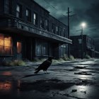 A solitary raven stands on a wet, abandoned street, reflecting the dim light of a flickering neon sign amidst derelict buildings and overgrown vegetation under a dramatic, moody sky.