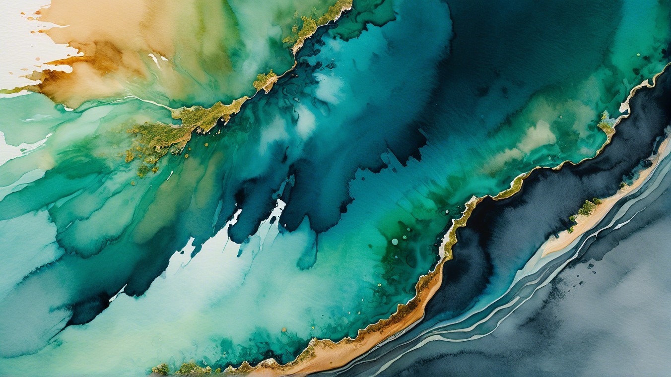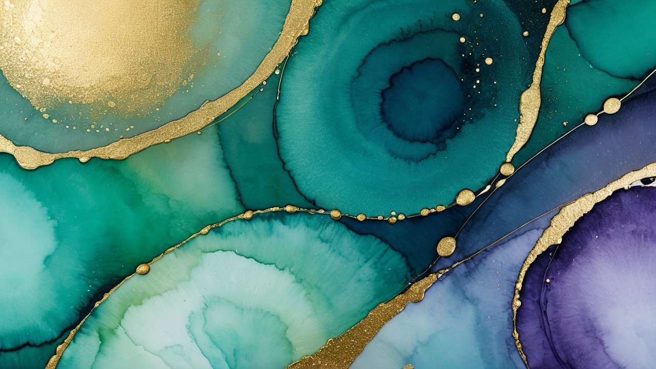 The image features vibrant colors of teal, blue, and orange, with an abstract swirl pattern created by oil droplets and bubbles trapped in a liquid, creating a mesmerizing, fluid appearance.