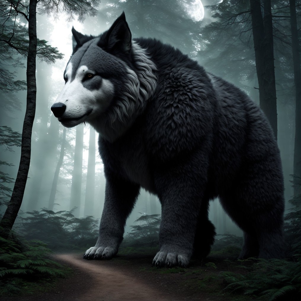 A colossal, wolf-like creature stands in a foggy forest with the moon glowing subtly in the background.