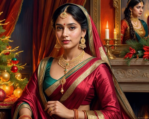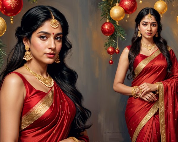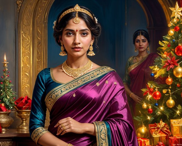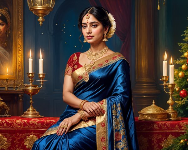 A serene portrait of a woman with dark hair styled elegantly, adorned with flowers. She wears statement earrings and gazes softly, exuding grace against a softly blurred green background.