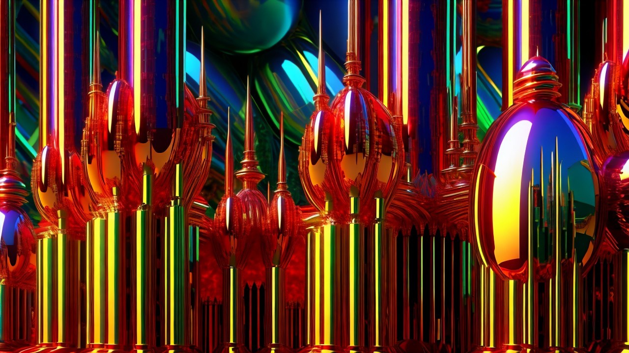 The image showcases a majestic cathedral interior, featuring towering arches and colorful stained glass windows. Dramatic lighting casts vibrant hues, creating a mystical atmosphere.