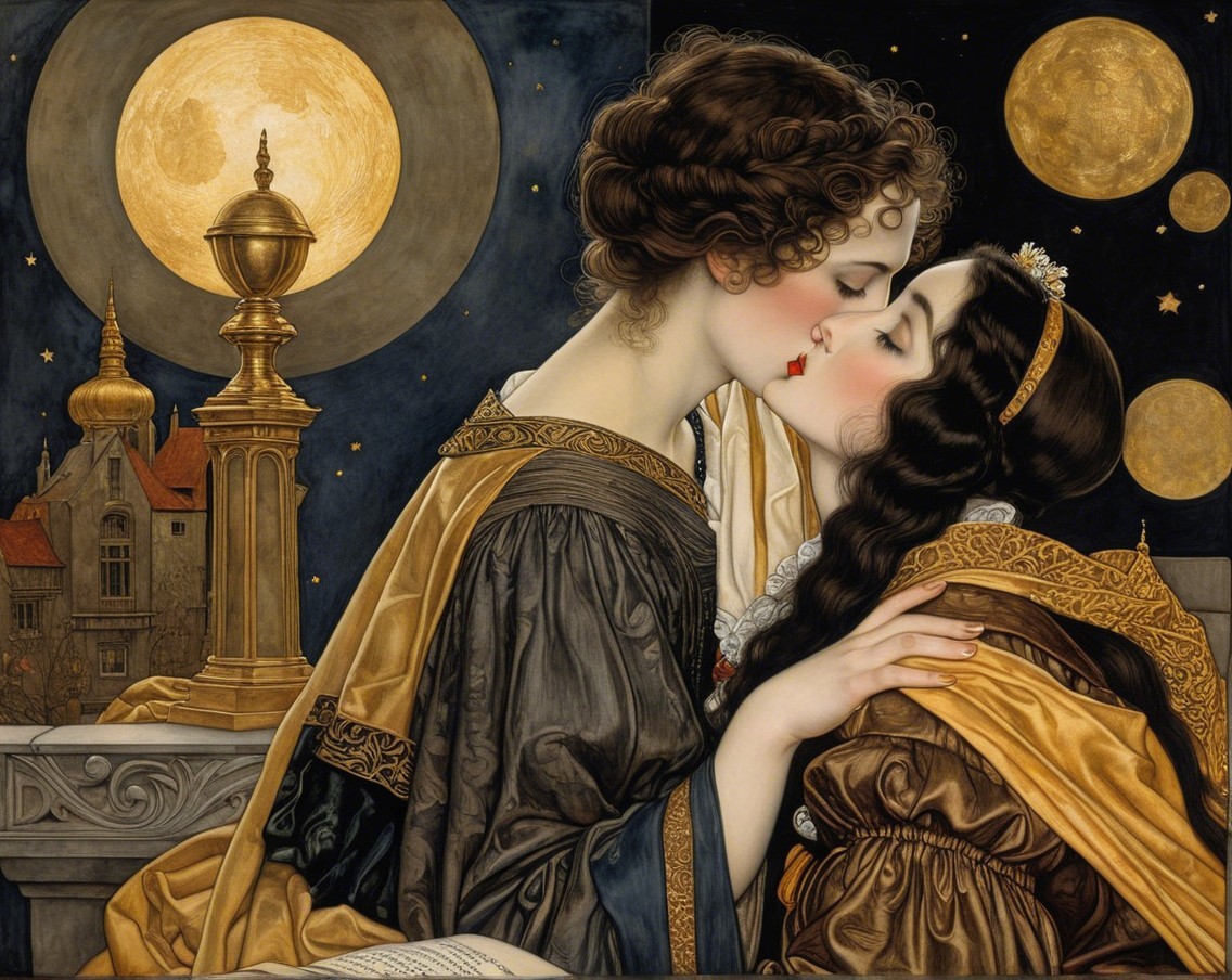 Three elegant women with flowing hair and striking red lips are depicted in a close embrace, surrounded by rich colors, intricate patterns, and a glowing moonlit backdrop, creating a dreamlike atmosphere.
