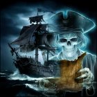 A pirate-themed scene featuring a skeleton in a tricorn hat holding an ancient book. In the background, a majestic ship sails through turbulent waters under a dramatic sky.