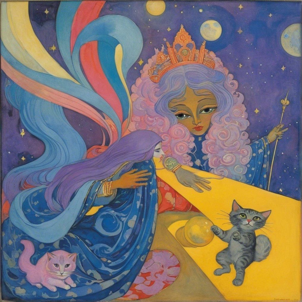 A vibrant illustration featuring a whimsical girl with colorful hair, adorned in intricate patterns and a flowing dress. She stands against a cosmic background filled with stars and swirling galaxies.