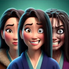 The image features three characters: a cheerful young woman in traditional clothing, her slightly anxious counterpart, and a spooky, disheveled figure with an eerie, unsettling expression behind her.