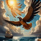 A stunning scene of birds soaring against a bright sunlit sky, surrounded by dramatic clouds. The ocean glistens below, with rocky cliffs adding to the serene, magical atmosphere.