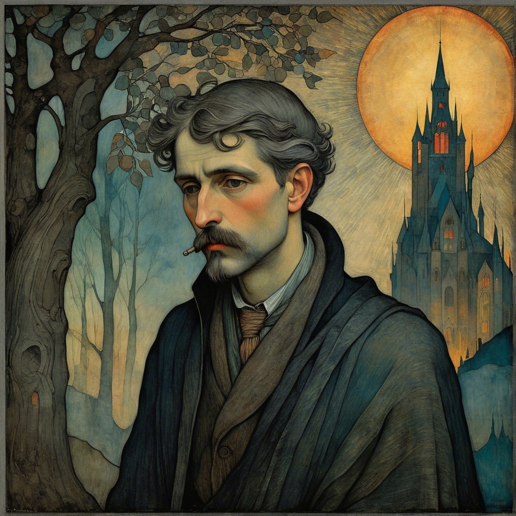 A brooding man with a mustache stands against a moonlit backdrop, featuring a gothic castle and bare trees. His expression is contemplative, evoking a sense of mystery and nostalgia.
