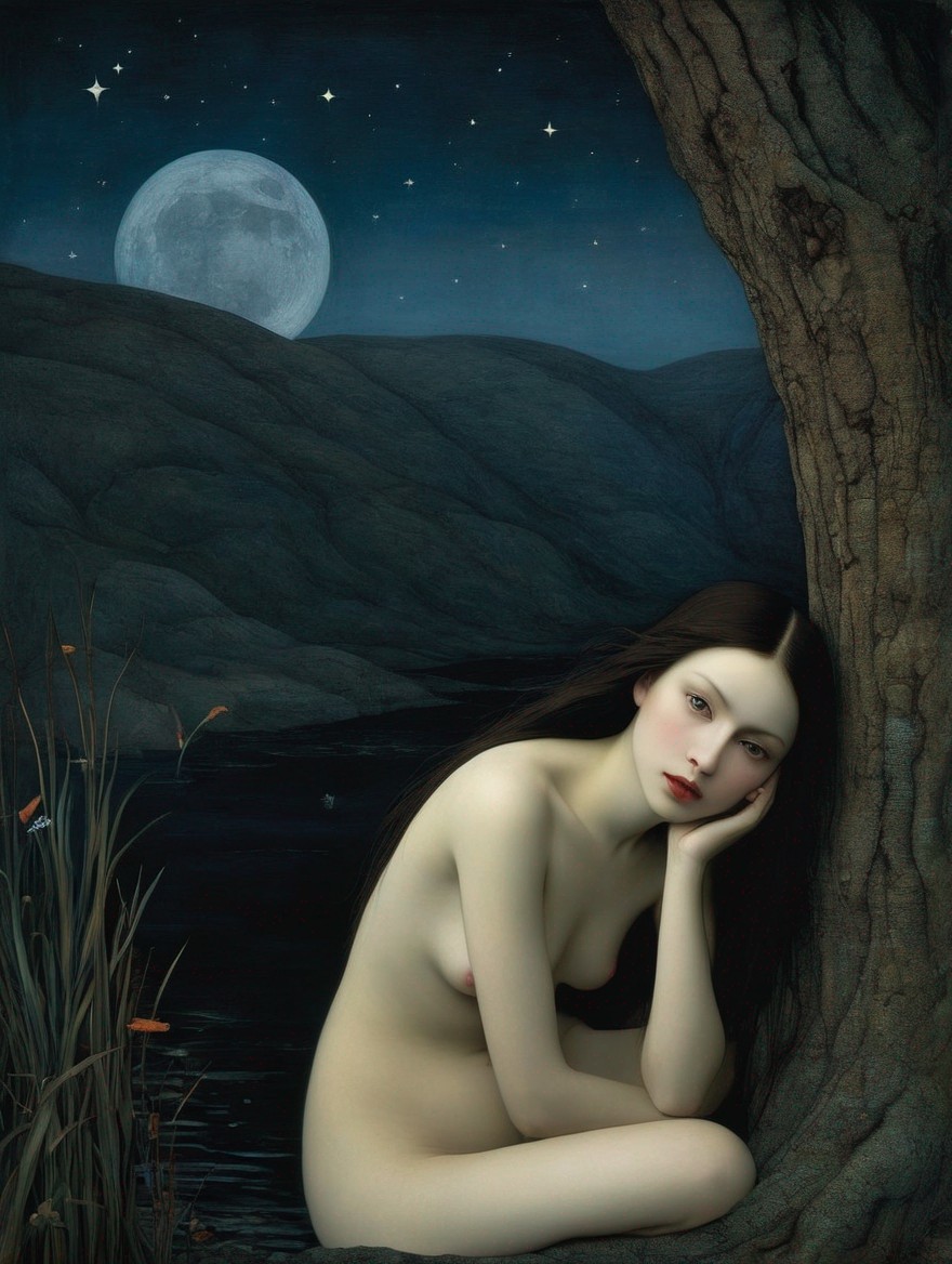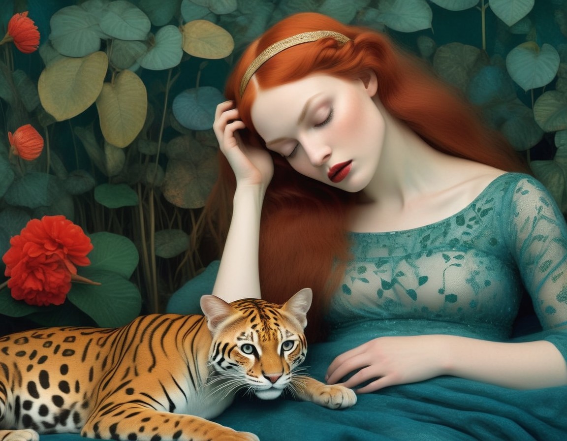 A woman with flowing red hair sleeps in a mystical forest; a tiger cub rests beside her on a lush blue fabric amidst blooming flowers.