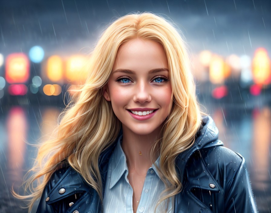 Smiling Woman in Black Jacket in Rainy Urban Scene