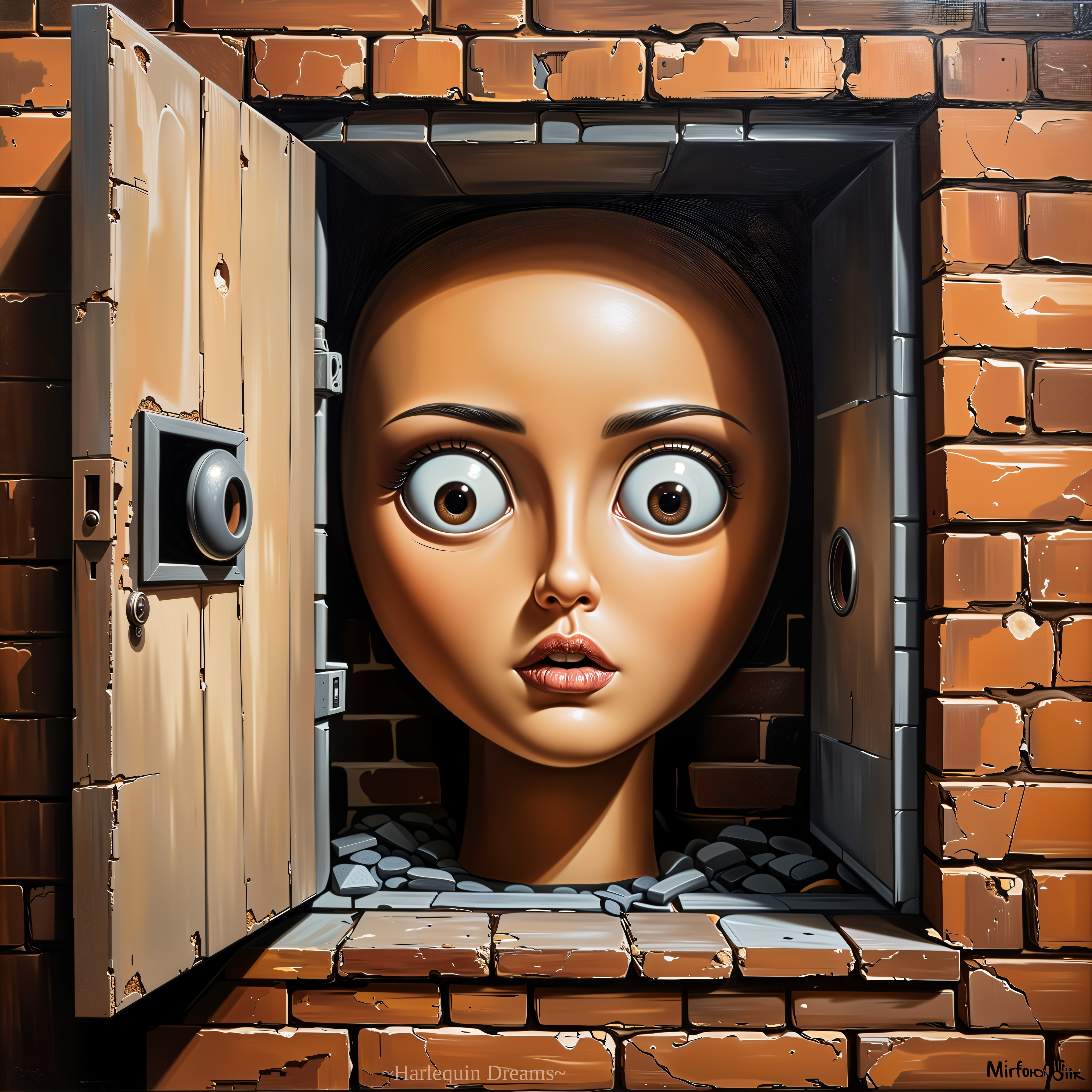 The artwork features a large, expressive face peering through a rustic, open door set in a brick wall, surrounded by small stones, evoking a sense of curiosity and surrealism.