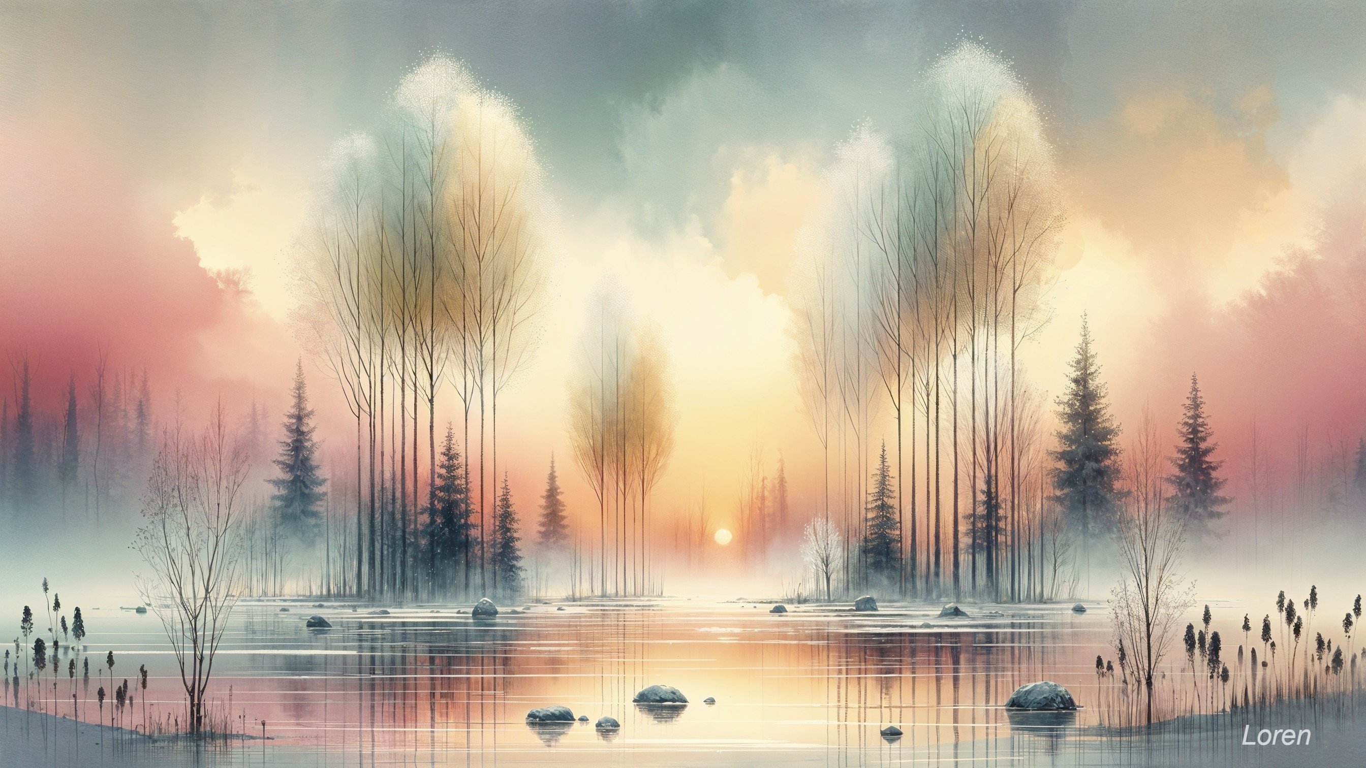 A serene landscape at sunrise, featuring tall, ethereal trees reflected in calm waters. Mist envelops the scene, while soft hues of orange and pink blend into the sky. Tranquility prevails.