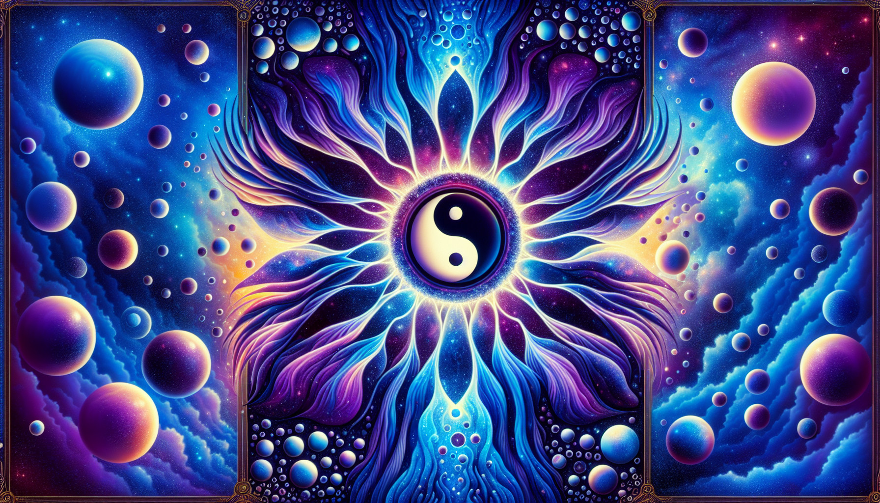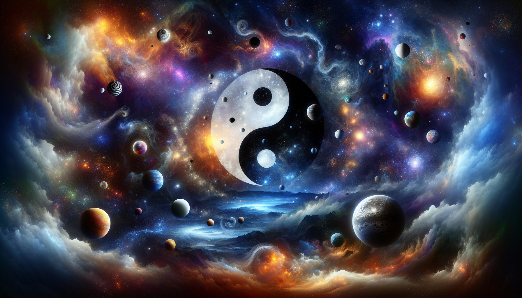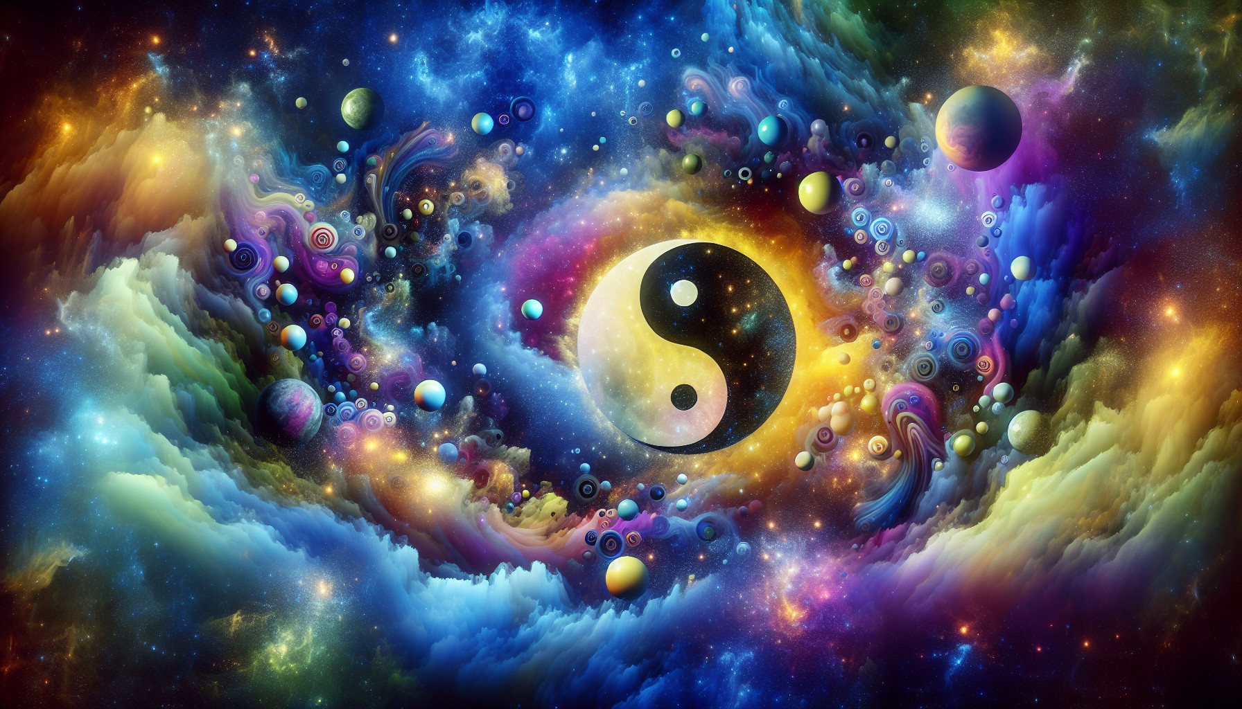 A cosmic scene featuring vibrant nebulae and celestial bodies, centered around a glowing yin-yang symbol. Colorful swirls and stars create a mesmerizing blend of harmony and chaos in space.