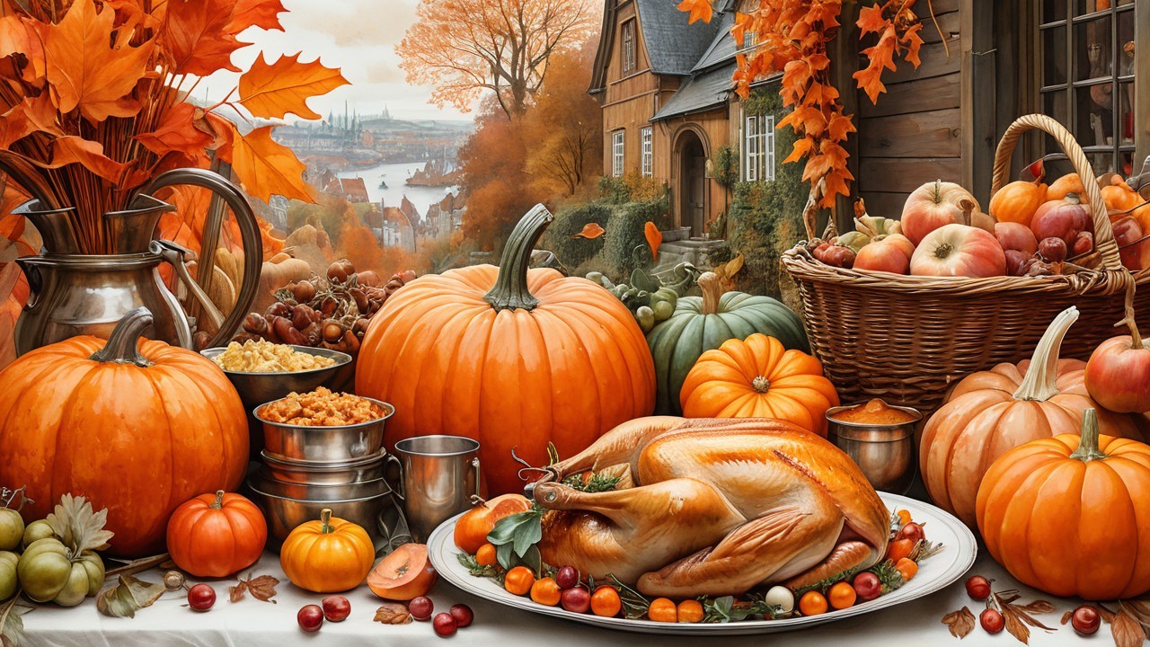 Prompt: "A lavish autumn feast scene captured in ultra HD detail, vibrant orange and brown hues, vintage watercolor style reminiscent of Joachim Beuckelaer's art, intricate line work inspired by Carne Griffiths, bold color usage akin to Wadim Kashim, light and airy composition influence from Carl Larsson, hyper-realistic character design touch from Pascal Blanche, matte painting technique integration, dynamic and polished feel, sharp focus, smooth transitions, dramatic and expressive camera angle, matte painting concept art essence, balanced compositions using golden ratio, trending on CGSociety and Artstation, studio photo quality, highly detailed with intricate details, by Greg Rutkowski."