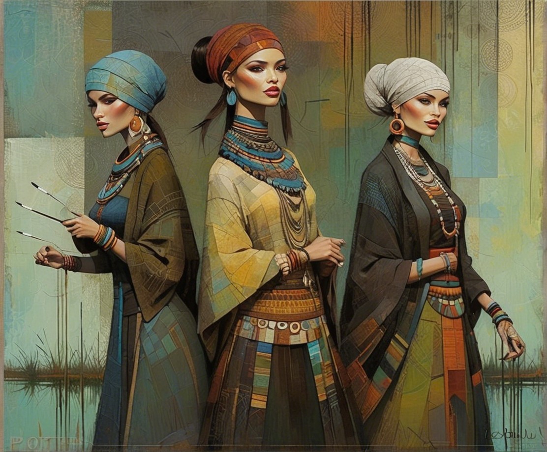 Three women art nouveau, elongated hands, green clothing, brown clothing, sun golden yellow in the background, big hats on the head, thin flower on the left side of the pic, colorful background, green background, detailed faces, beautiful faces, red lipstick on the lips, wearing necklaces, water under