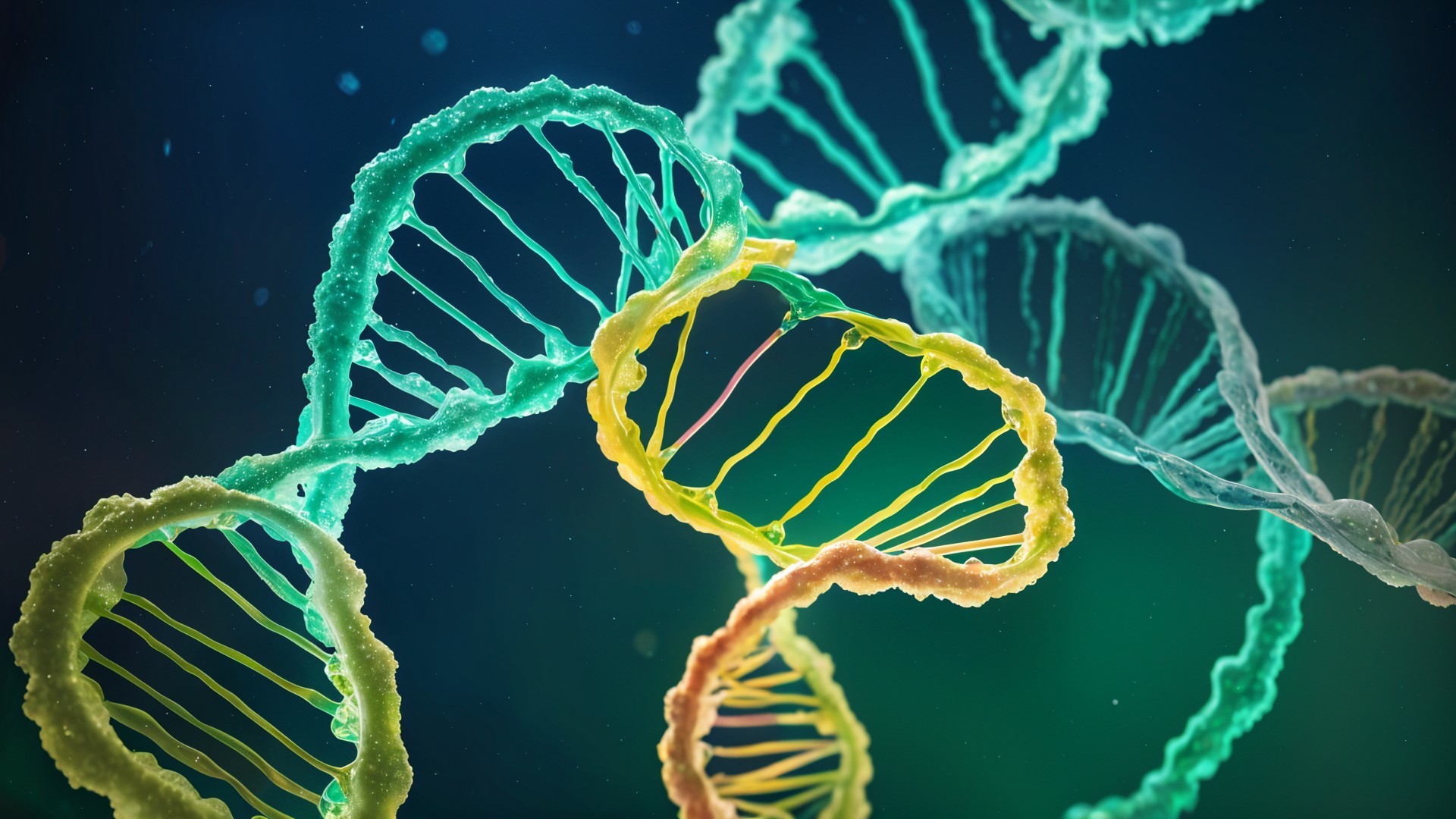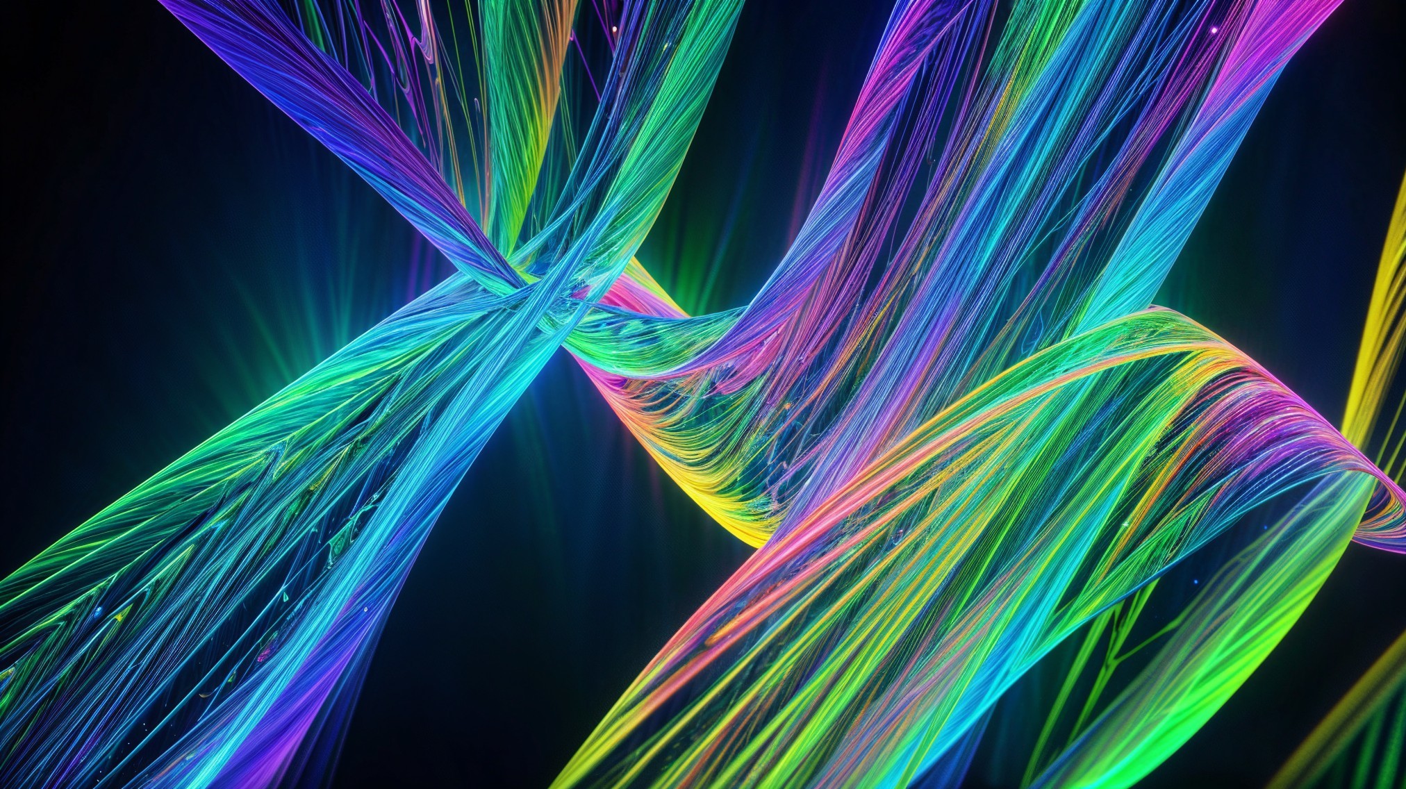 The image features vibrant, colorful abstract strands intertwining in a dynamic display of neon hues, creating a lively, energetic scene against a dark background.