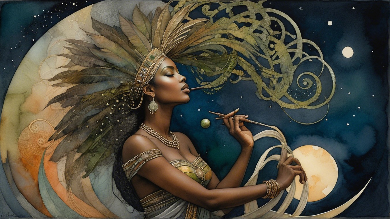 A serene woman adorned with a headdress of leaves plays a flute, surrounded by a mystical night sky with ethereal colors and celestial bodies, embodying grace and connection to nature.
