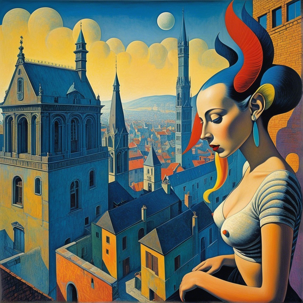 The image features a surreal scene with a woman in a stylish top, gazing thoughtfully from a rooftop. Behind her, a vibrant cityscape with distinctive architecture and a colorful sky unfolds.